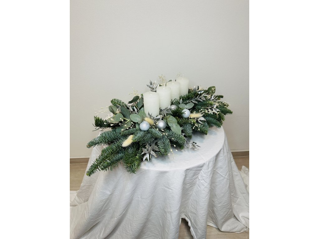 Adventní štola z jedle nobilis, eukalyptu, sušených a stabilizovaných květin se svíčkami na dřevěném podnosu