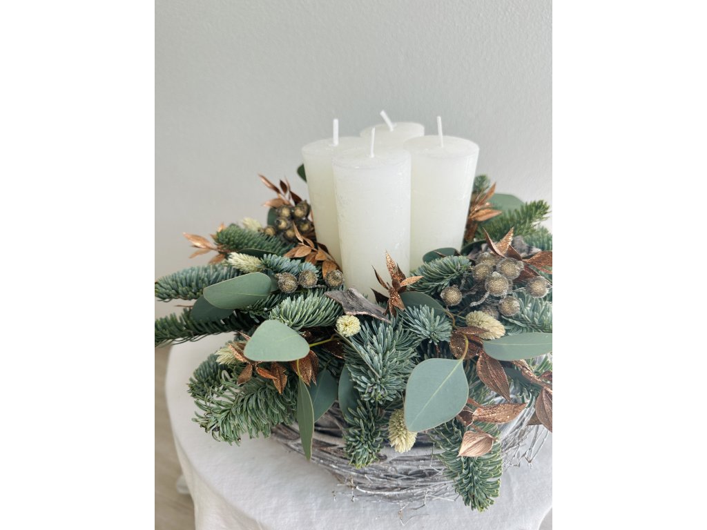 Adventní svícen v proutěném hnízdečku z jedle nobilis, eukalyptu, sušených a stabilizovaných květin se svíčkami