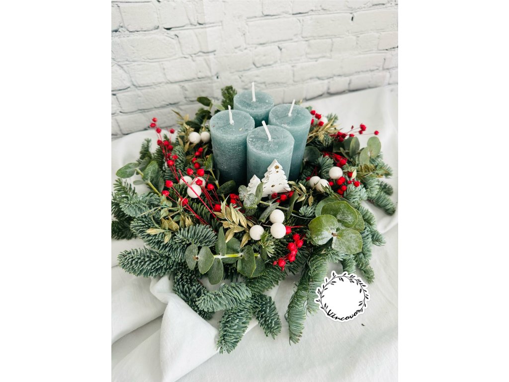 Adventní věnec z jedle nobilis, eukalyptu, sušených a stabilizovaných květin se svíčkami
