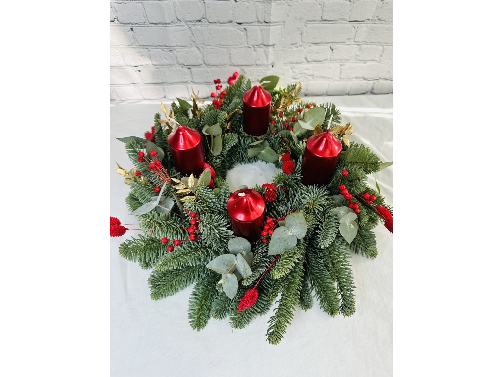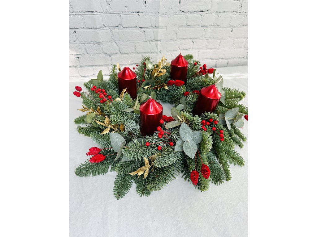 Adventní věnec z jedle nobilis, eukalyptu, sušených a stabilizovaných květin se svíčkami