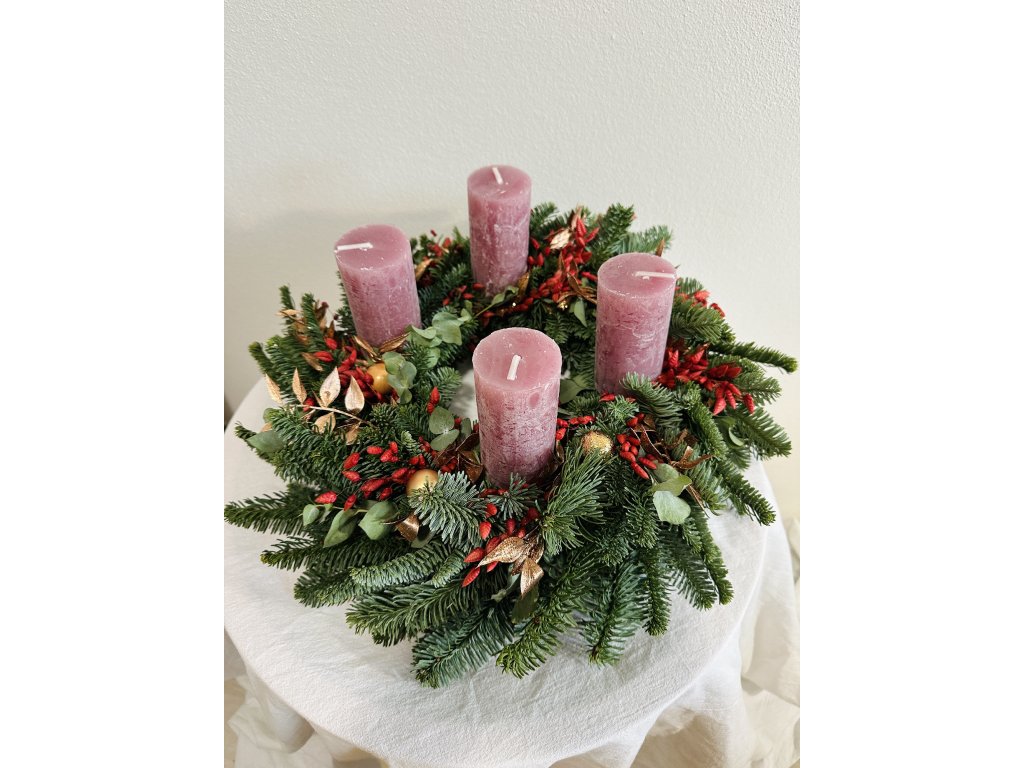 Adventní věnec z jedle nobilis, eukalyptu, sušených a stabilizovaných květin se svíčkami