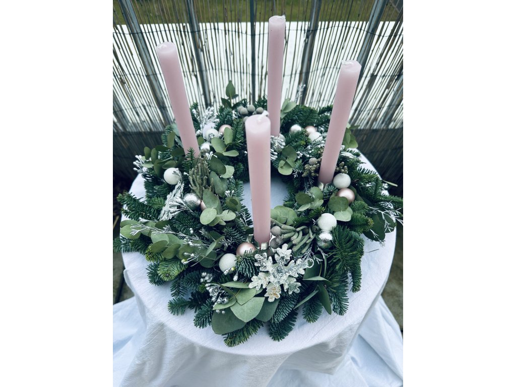 Adventní věnec z jedle nobilis, eukalyptu, sušených a stabilizovaných květin se svíčkami