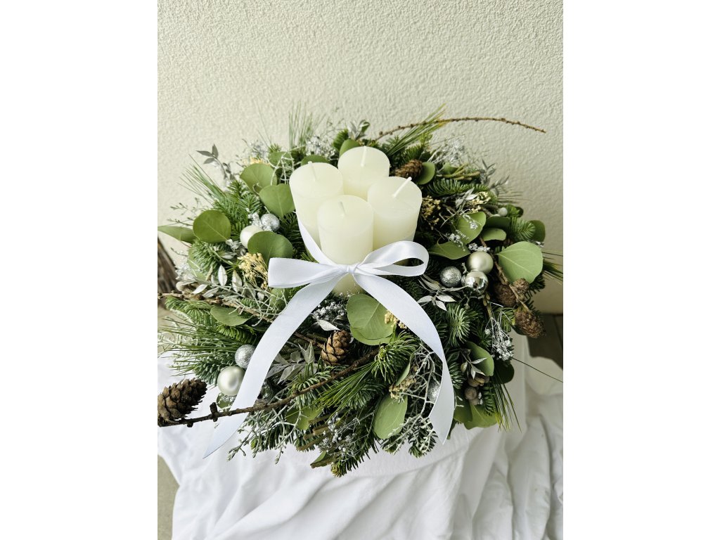 Elegantní adventní věnec z jedle nobilis, eukalyptu, sušených a stabilizovaných květin se svíčkami