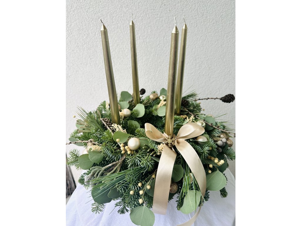Elegantní adventní věnec z jedle nobilis, eukalyptu, sušených a stabilizovaných květin se svíčkami