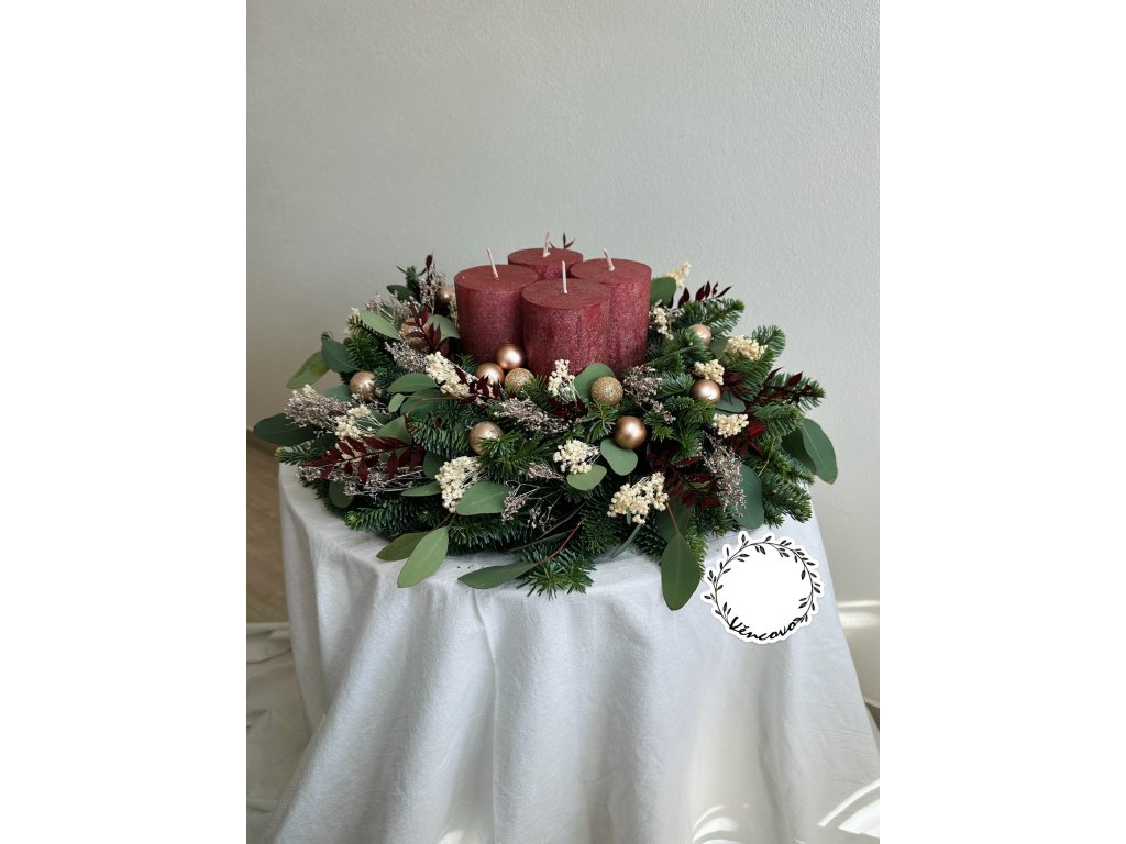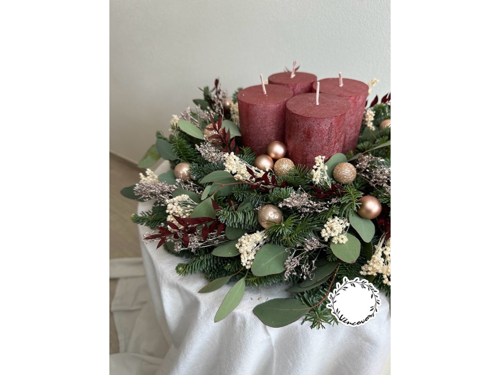 Adventní věnec z jedle nobilis, eukalyptu, sušených a stabilizovaných květin se svíčkami