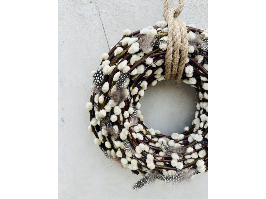 Věnec z kočiček na proutěném podkladě s pírky a lanem o průměru 30-35 cm