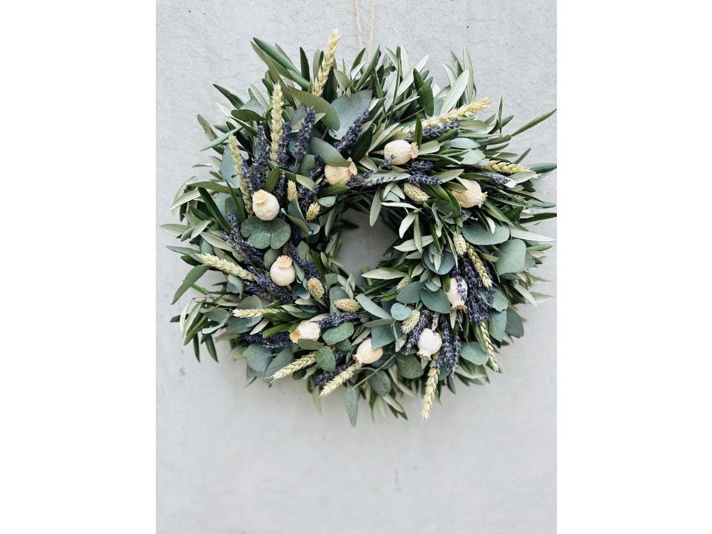 Věnec vydrží dlouho krásný, jelikož je tvořen i ze stabilizovaného eukalyptu, který nemění svůj tvar ani barvu. Je však tvořen i z eukalyptu čerstvého.