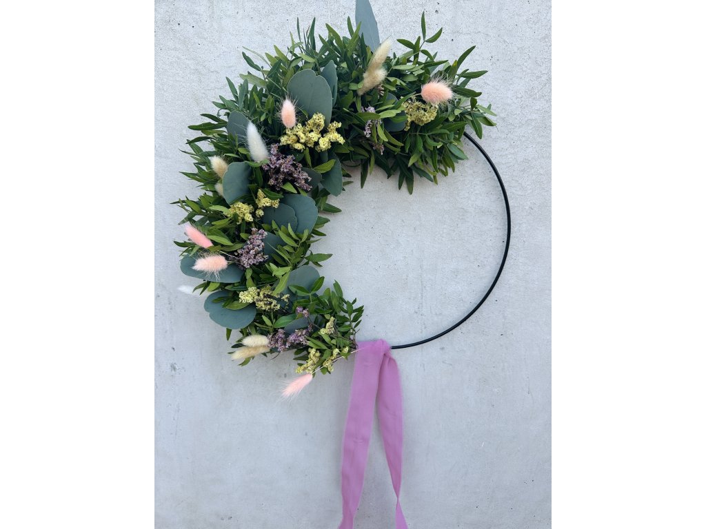 Půlvěnec na kovovém kruhu z pistácie, eukalyptu a sušených květin o průměru 30-35 cm