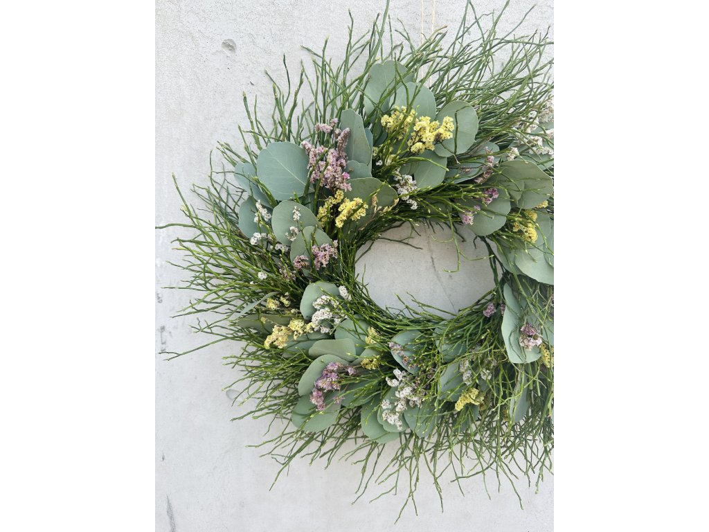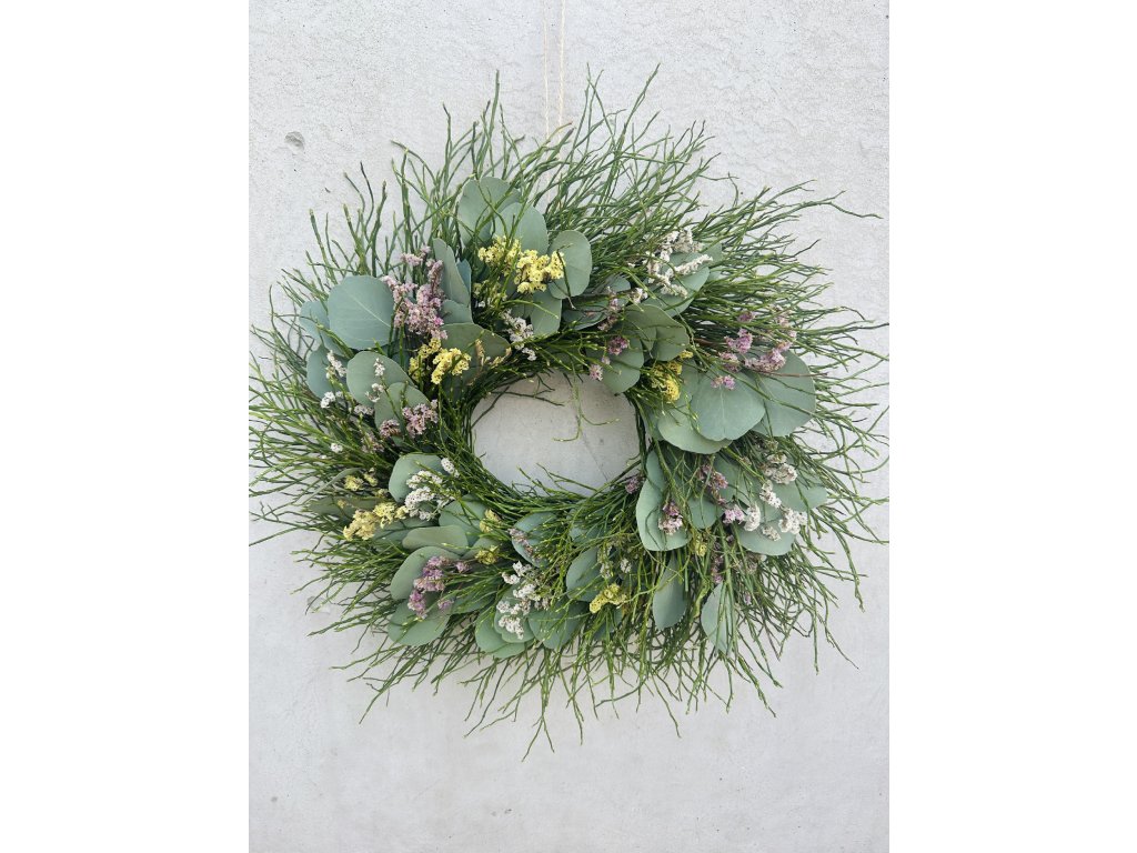 Věnec z borůvčí a eukalyptu, doplněný o statici v různých barvách o průměru 45-50 cm