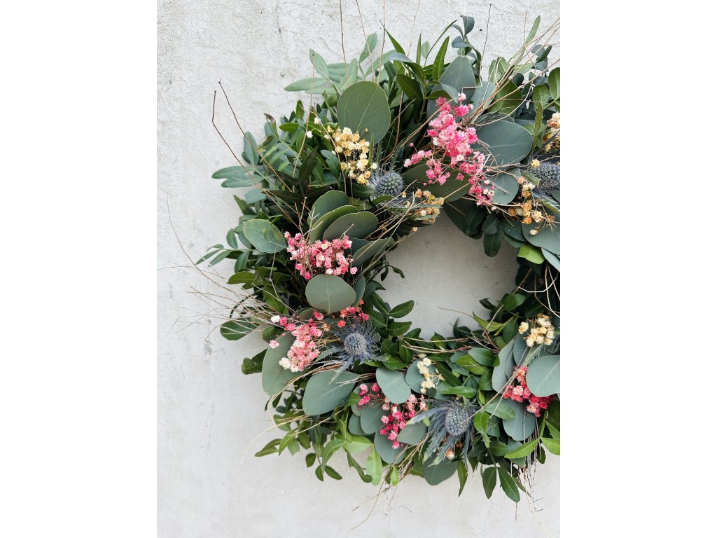 Věnec z eukalyptu, pistácie, euforbie, eryngia a nevěstina závoje v různých barvách (např. růžová, meruňková, žlutá, světle modrá či zelená) o průměru 35-40 cm