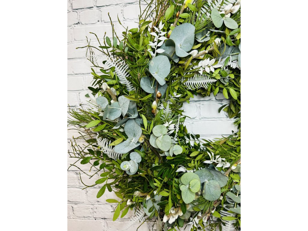 Věnec z eukalyptu, pistácie, borůvčí, kočičky, bělený stabilizovaný ruscus a kapradina o průměru 45-50 cm