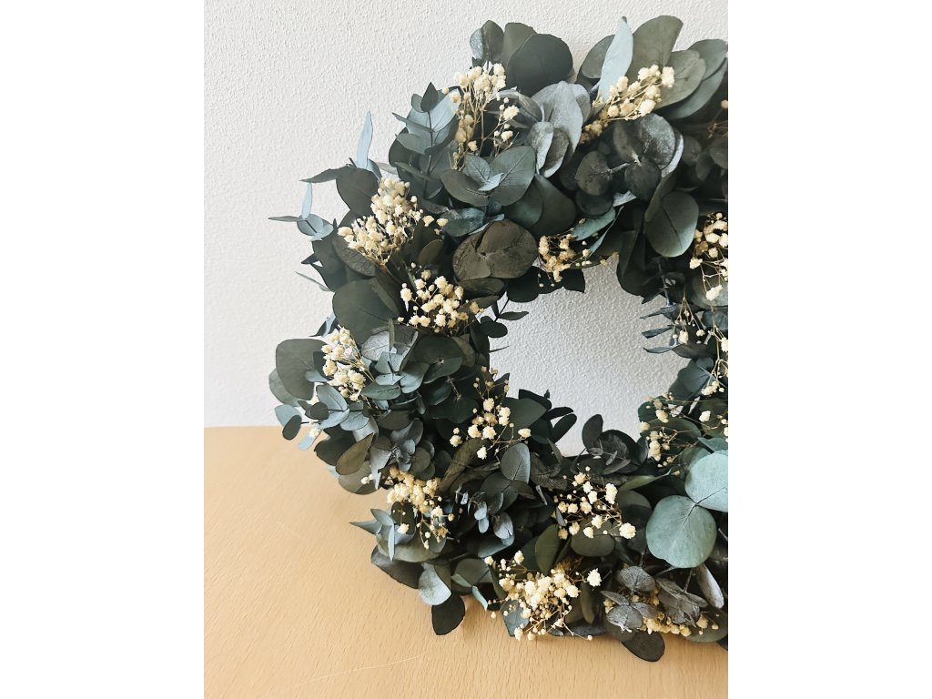Věnec vydrží dlouho krásný, jelikož je tvořen ze stabilizovaného eukalyptu a nevěstina závoje, který nemění svůj tvar ani barvu.