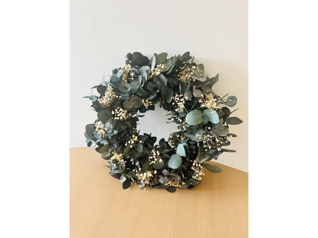 Věnec vydrží dlouho krásný, jelikož je tvořen ze stabilizovaného eukalyptu a nevěstina závoje, který nemění svůj tvar ani barvu.