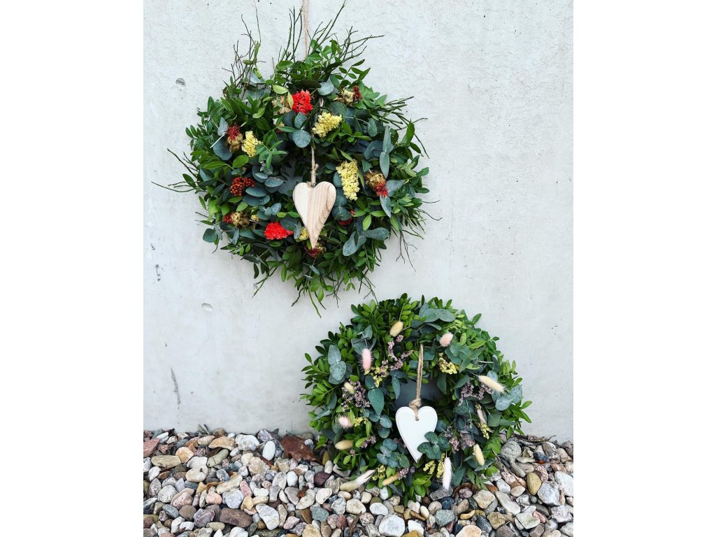 Věnce nejsou vhodné do vlhka, sušené a stabilizované květiny jsou barvené a můžou pouštět barvu.